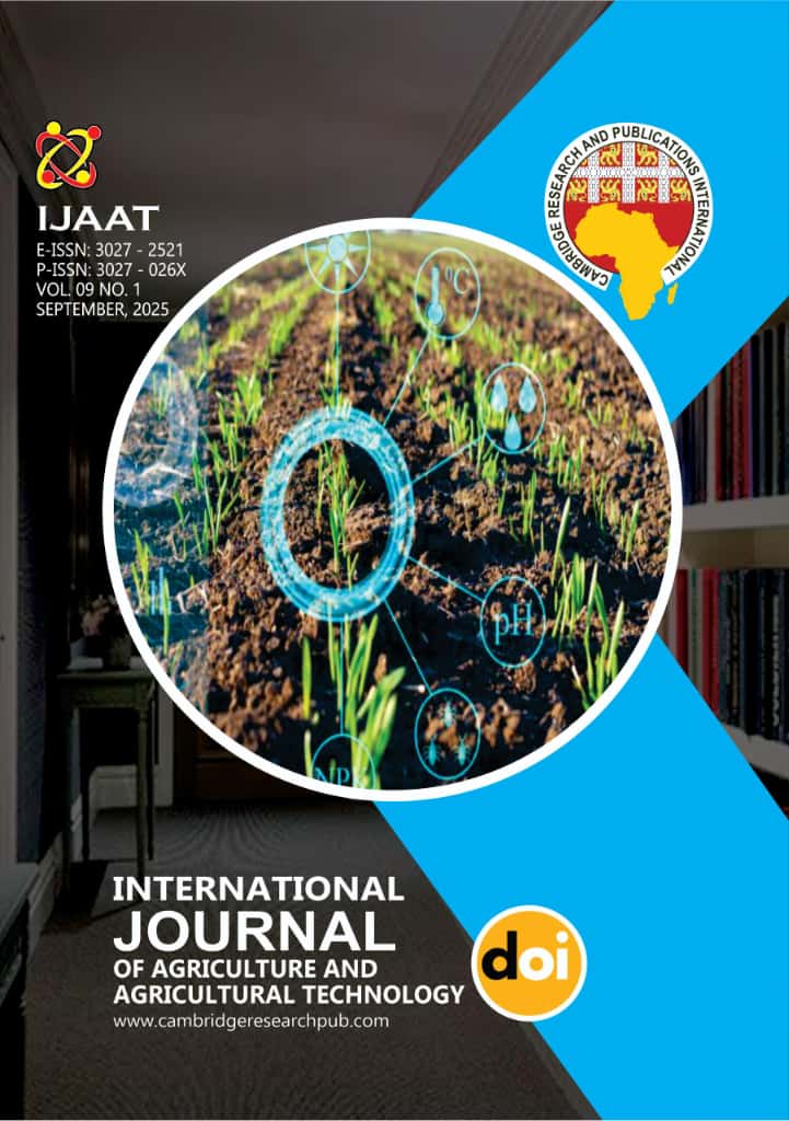 International Journal of Agriculture and Agricultural Technology is a peer-reviewed, open access scholarly journal committed to the advancement of knowledge, innovation, and best practices in agriculture and its related fields. The journal provides a global platform for researchers, professionals, and practitioners to share high-quality research findings that contribute to sustainable agricultural development, food security, and modernisation of agro-technological systems.
